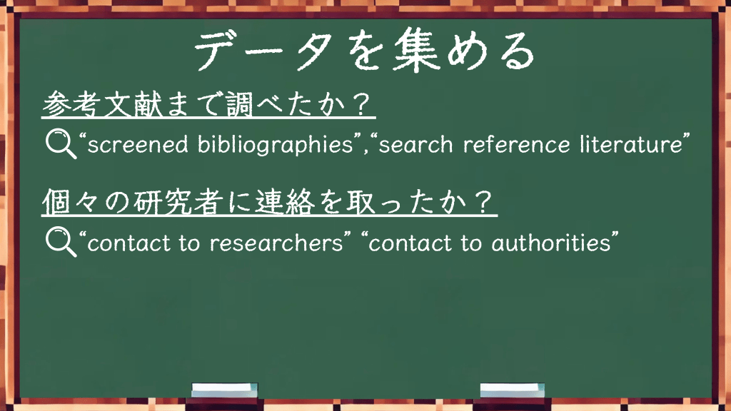 #24. データを集める 参考文献まで調べたか? “screened bibliographies”,“search reference literature” 個々の研究者に連絡を取ったか? “contact to researchers” “contact to authorities”