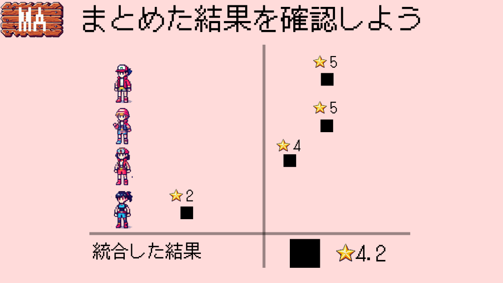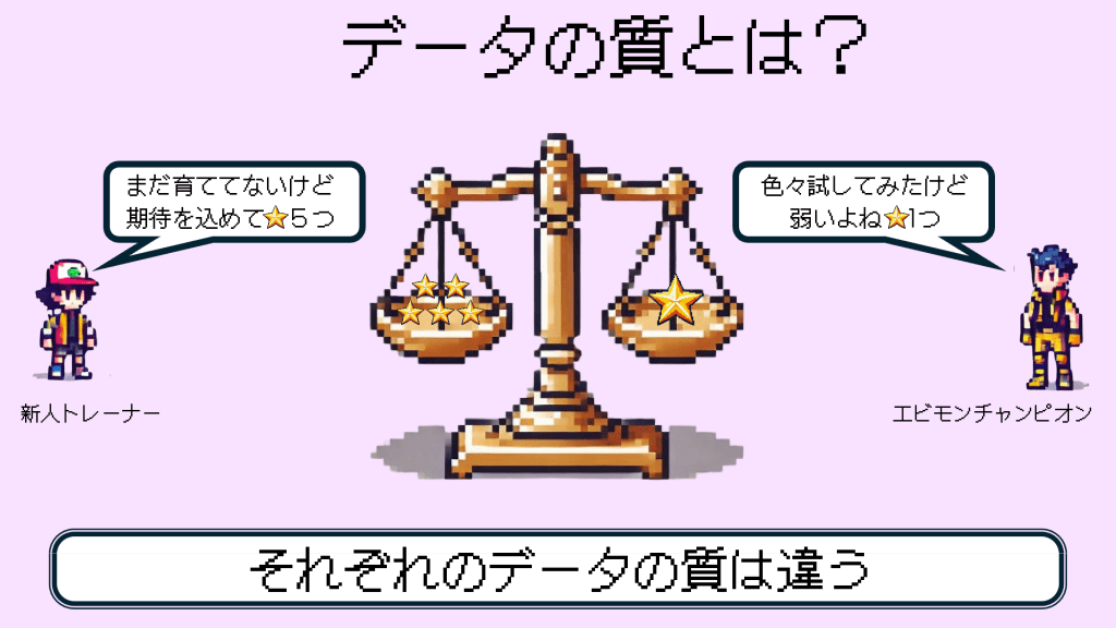 #27. データの質とは? まだ育ててないけど 期待を込めて 5つ 色々試してみたけど 弱いよね 1つ 新人トレーナー エビモンチャンピオン それぞれのデータの質は違う