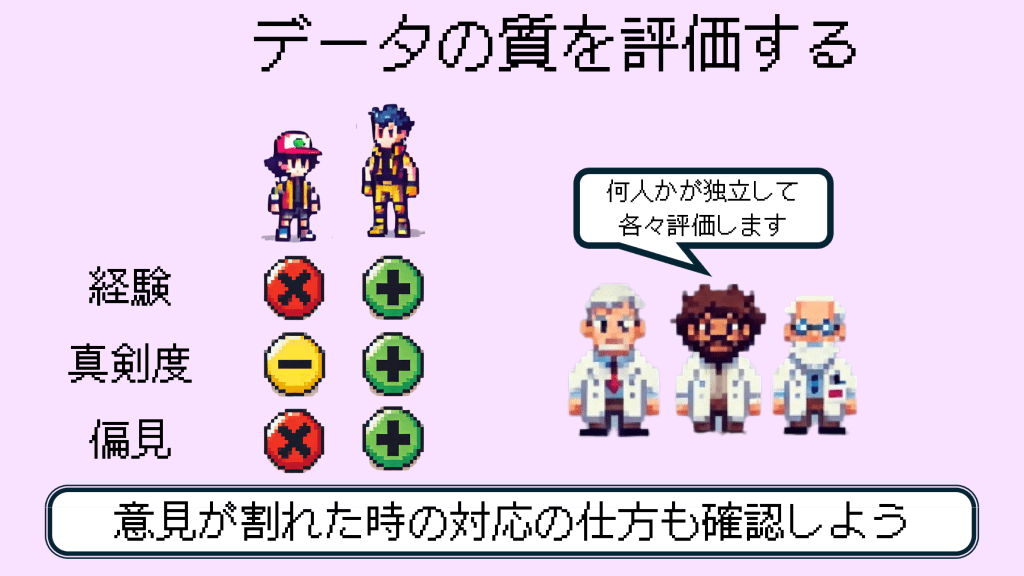 #28. データの質を評価する 何人かが独立して 各々評価します 経験 真剣度 偏見 意見が割れた時の対応の仕方も確認しよう