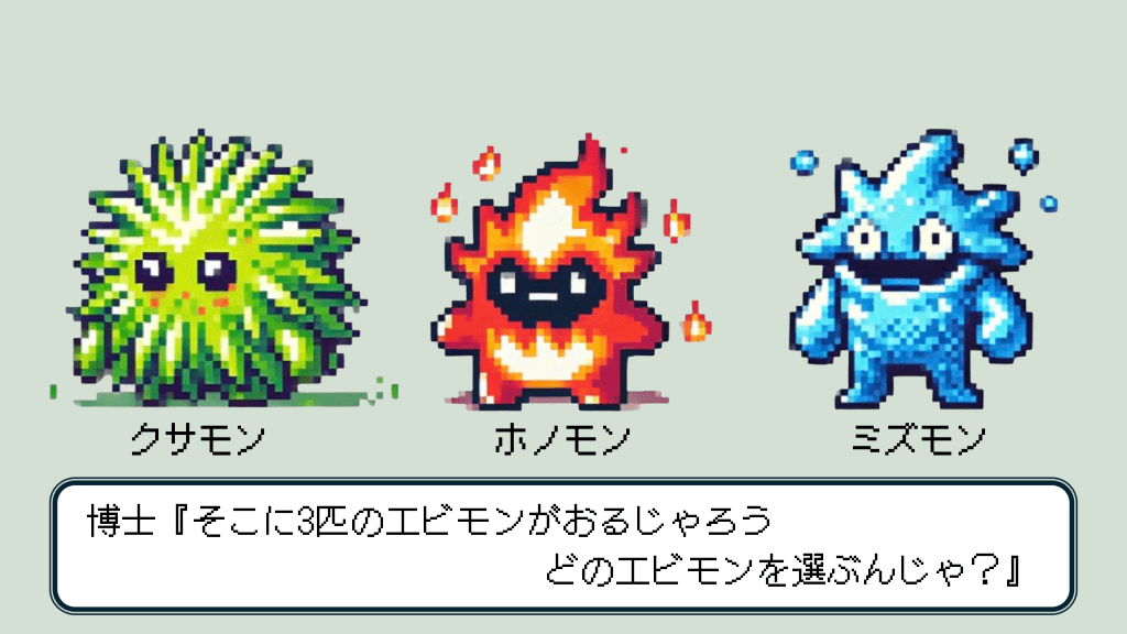 #3. クサモン ホノモン ミズモン 博士『そこに3匹のエビモンがおるじゃろう どのエビモンを選ぶんじゃ?』