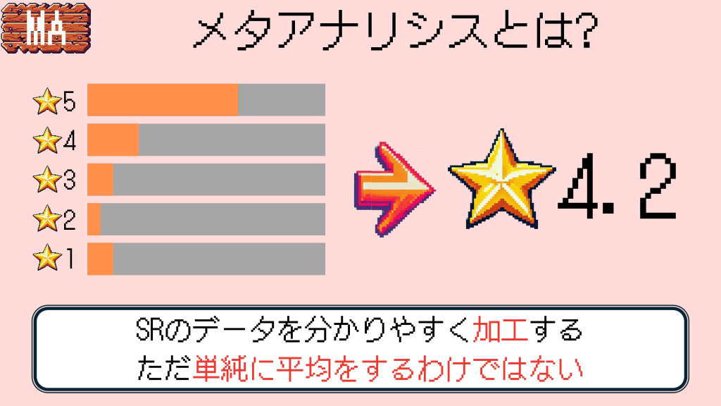 #35. MA メタアナリシスとは? 5 4 3 2 4.2 1 SRのデータを分かりやすく加工する ただ単純に平均をするわけではない