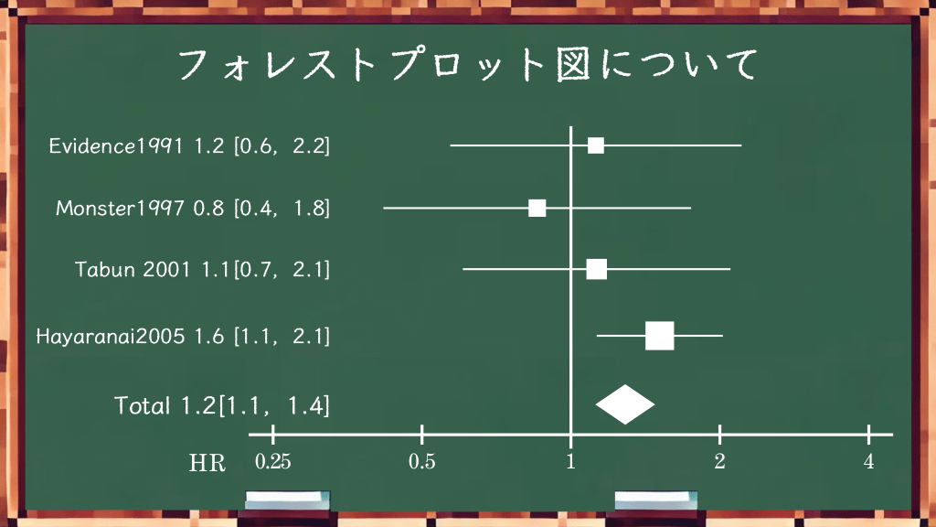 #38. フォレストプロット図について Evidence1991 1.2 [0.6,2.2] Monster1997 0.8 [0.4,1.8] Tabun 2001 1.1[0.7,2.1] Hayaranai2005 1.6 [1.1,2.1] Total 1.2[1.1,1.4] HR 0.25 0.5 1 2 4