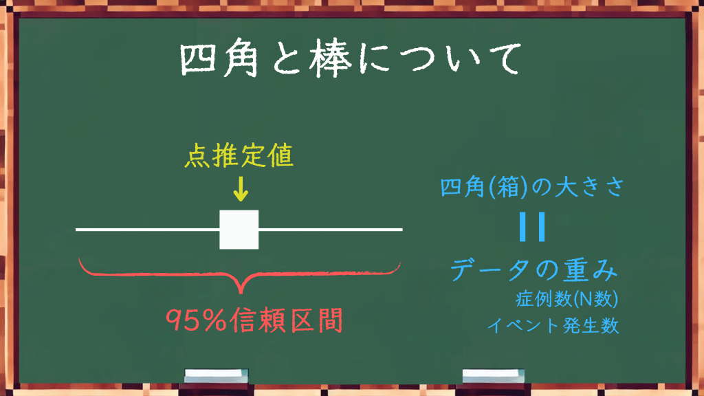 #39. 四角と棒について 点推定値 = 四角(箱)の大きさ データの重み 95%信頼区間 症例数(N数) イベント発生数
