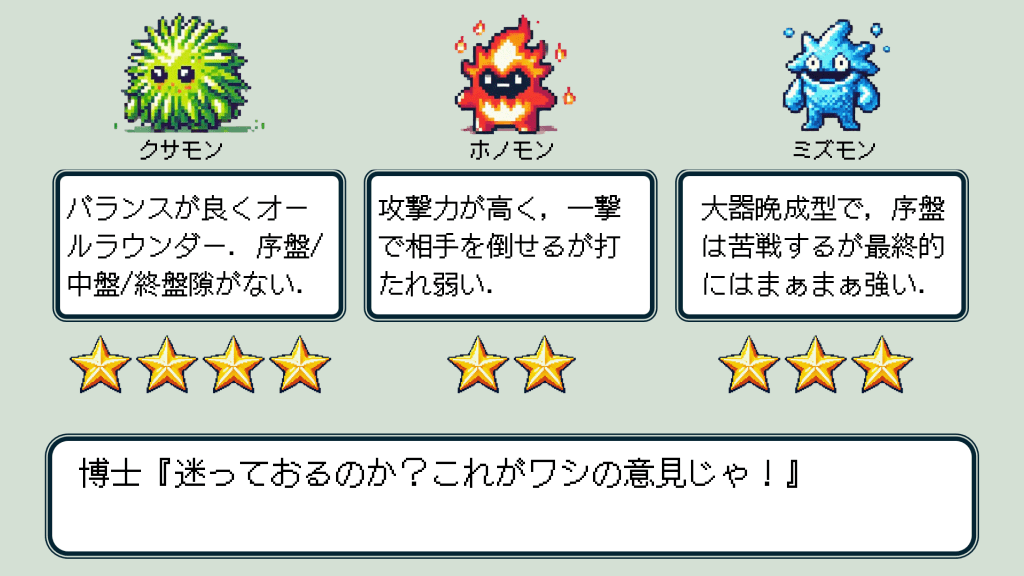 #4. クサモン バランスが良くオー ルラウンダー.序盤/ 中盤/終盤隙がない. ホノモン 攻撃力が高く,一撃 で相手を倒せるが打 たれ弱い. ミズモン 大器晩成型で,序盤 は苦戦するが最終的 にはまぁまぁ強い. 博士『迷っておるのか?これがワシの意見じゃ!』