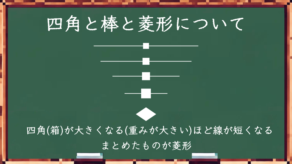 #40. 四角と棒と菱形について 四角(箱)が大きくなる(重みが大きい)ほど線が短くなる まとめたものが菱形