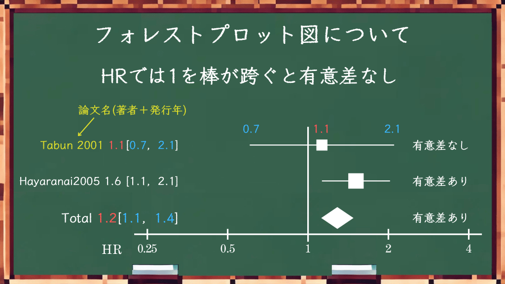 #41. フォレストプロット図について HRでは1を棒が跨ぐと有意差なし 論文名(著者+発行年) 0.7 1.1 2.1 Tabun 2001 1.1[0.7,2.1] 有意差なし Hayaranai2005 1.6 [1.1,2.1] 有意差あり Total 1.2[1.1,1.4] 有意差あり HR 0.25 0.5 1 2 4