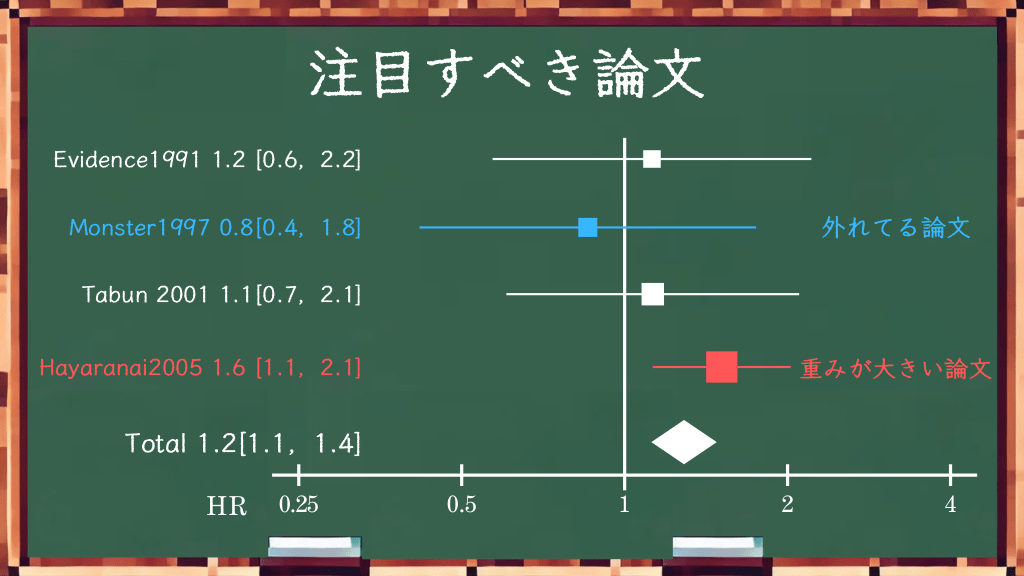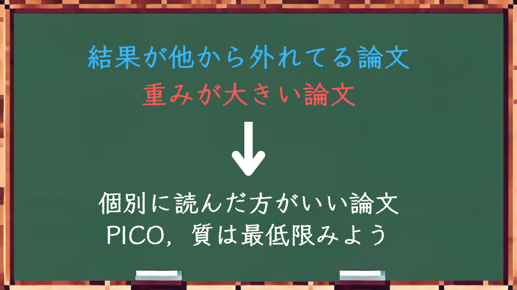 #43. 結果が他から外れてる論文 重みが大きい論文 個別に読んだ方がいい論文 PICO,質は最低限みよう