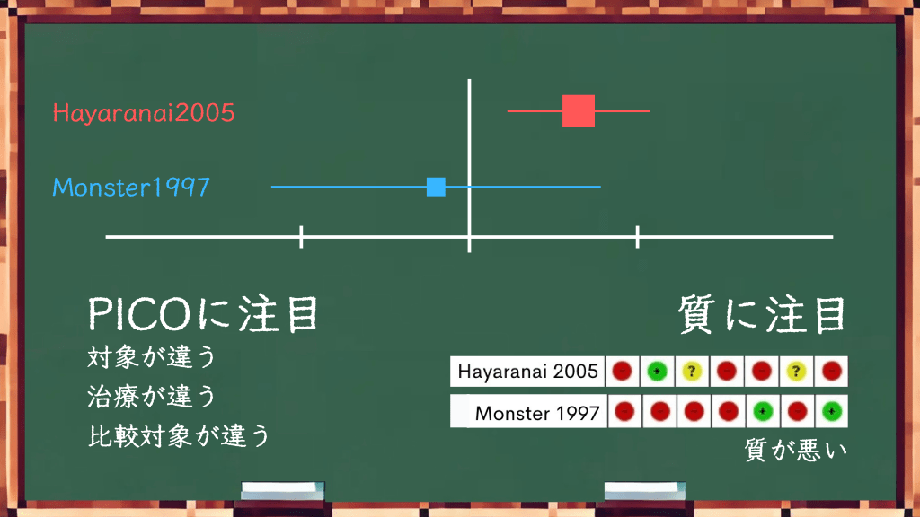 #44. Hayaranai2005 Monster1997 PICOに注目 対象が違う 治療が違う 比較対象が違う 質に注目 質が悪い