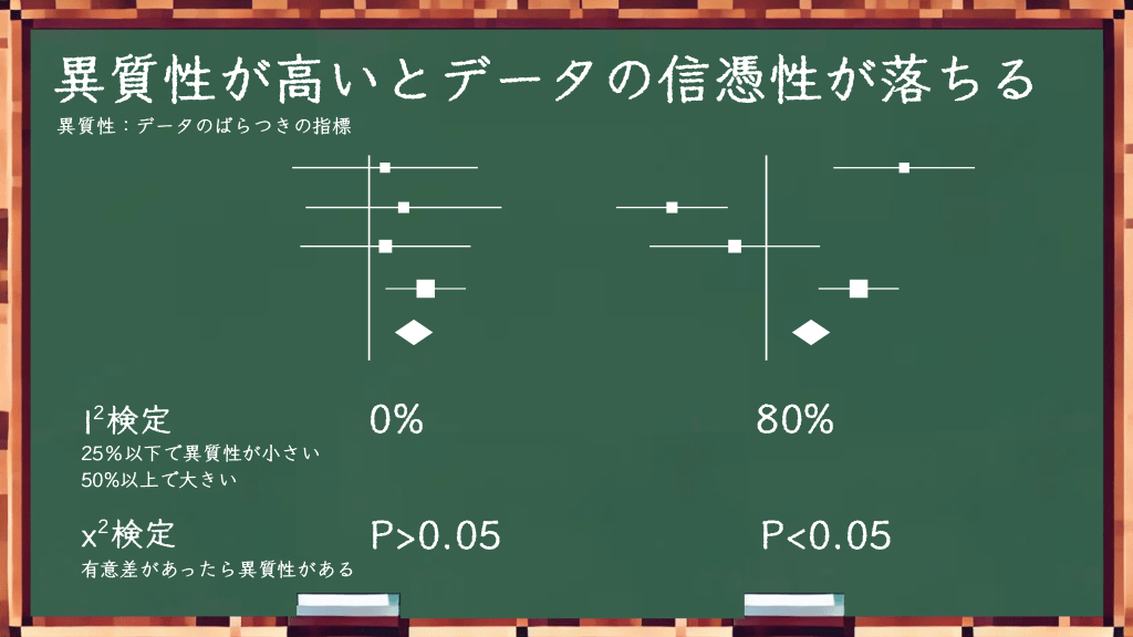 #45. 異質性が高いとデータの信憑性が落ちる 異質性:データのばらつきの指標 2 I 検定 0% 80% P>0.05 P<0.05 25%以下で異質性が小さい 50%以上で大きい 2 x 検定 有意差があったら異質性がある