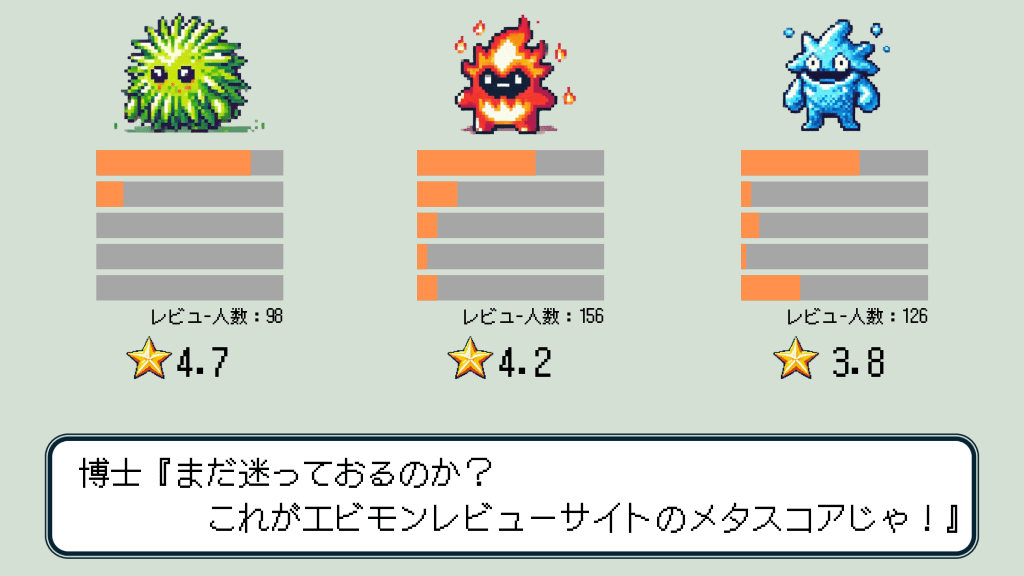 #5. レビュ-人数:98 4.7 レビュ-人数:156 4.2 レビュ-人数:126 3.8 博士『まだ迷っておるのか? これがエビモンレビューサイトのメタスコアじゃ!』