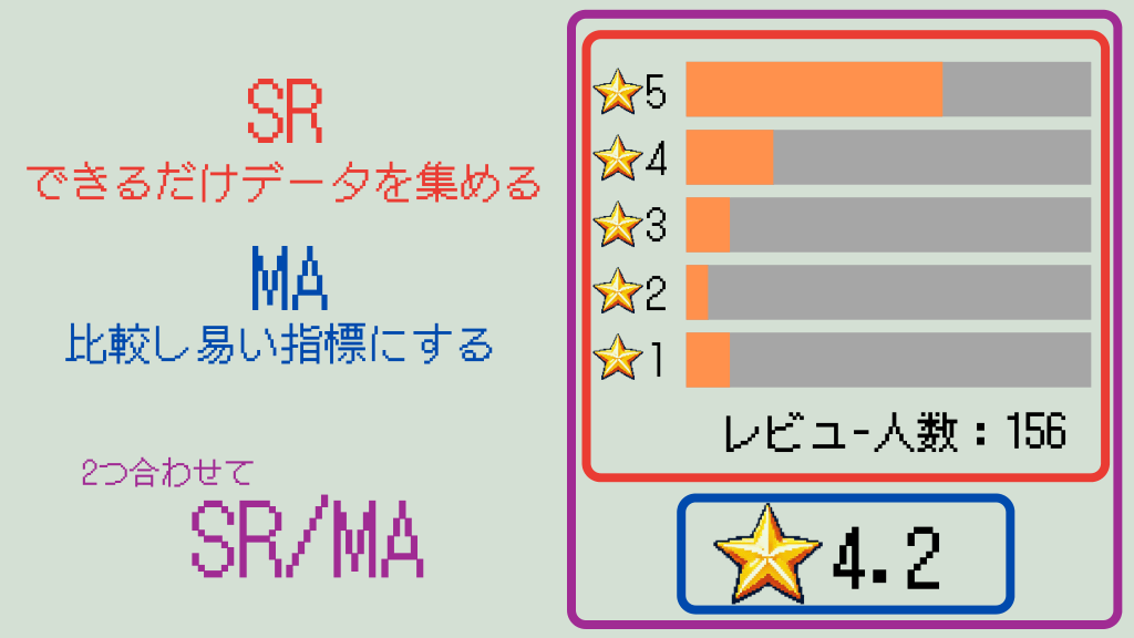 #6. SR できるだけデータを集める MA 比較し易い指標にする 5 4 3 2 1 レビュ-人数:156 2つ合わせて SR/MA 4.2