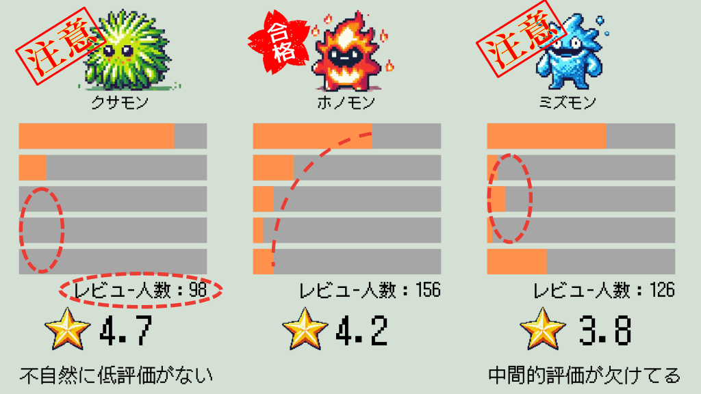 #9. クサモン レビュ-人数:98 4.7 不自然に低評価がない ホノモン レビュ-人数:156 4.2 ミズモン レビュ-人数:126 3.8 中間的評価が欠けてる
