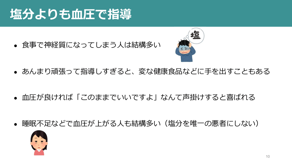 #10. 塩分よりも⾎圧で指導 ● ⾷事で神経質になってしまう⼈は結構多い ● あんまり頑張って指導しすぎると、変な健康⾷品などに⼿を出すこともある ● ⾎圧が良ければ「このままでいいですよ」なんて声掛けすると喜ばれる ● 睡眠不⾜などで⾎圧が上がる⼈も結構多い(塩分を唯⼀の悪者にしない) 10