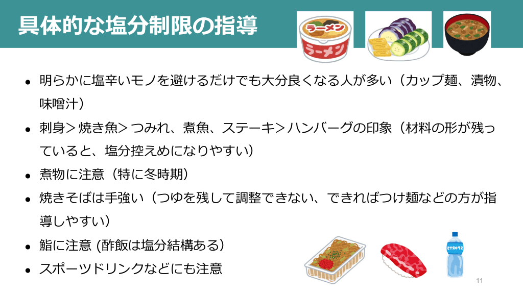 #11. 具体的な塩分制限の指導 ● 明らかに塩⾟いモノを避けるだけでも⼤分良くなる⼈が多い(カップ麺、漬物、 味噌汁) ● 刺⾝>焼き⿂>つみれ、煮⿂、ステーキ>ハンバーグの印象(材料の形が残っ ていると、塩分控えめになりやすい) ● 煮物に注意(特に冬時期) ● 焼きそばは⼿強い(つゆを残して調整できない、できればつけ麺などの⽅が指 導しやすい) ● 鮨に注意 (酢飯は塩分結構ある) ● スポーツドリンクなどにも注意 11