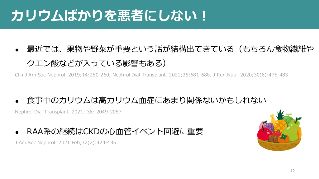 #12. カリウムばかりを悪者にしない︕ ● 最近では、果物や野菜が重要という話が結構出てきている(もちろん⾷物繊維や クエン酸などが⼊っている影響もある) Clin J Am Soc Nephrol. 2019;14:250-260, Nephrol Dial Transplant. 2021;36:681-688, J Ren Nutr. 2020;30(6):475-483 ● ⾷事中のカリウムは⾼カリウム⾎症にあまり関係ないかもしれない Nephrol Dial Transplant. 2021; 36: 2049-2057. ● RAA系の継続はCKDの⼼⾎管イベント回避に重要 J Am Soc Nephrol. 2021 Feb;32(2):424-435 12