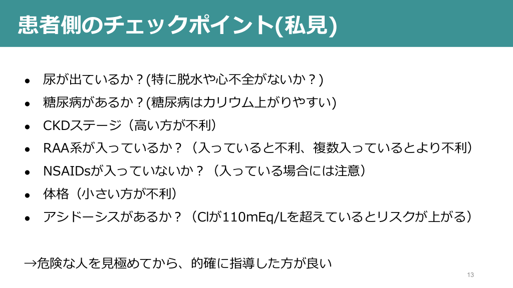#13. 患者側のチェックポイント(私⾒) ● 尿が出ているか︖(特に脱⽔や⼼不全がないか︖) ● 糖尿病があるか︖(糖尿病はカリウム上がりやすい) ● CKDステージ(⾼い⽅が不利) ● RAA系が⼊っているか︖(⼊っていると不利、複数⼊っているとより不利) ● NSAIDsが⼊っていないか︖(⼊っている場合には注意) ● 体格(⼩さい⽅が不利) ● アシドーシスがあるか︖(Clが110mEq/Lを超えているとリスクが上がる) →危険な⼈を⾒極めてから、的確に指導した⽅が良い 13