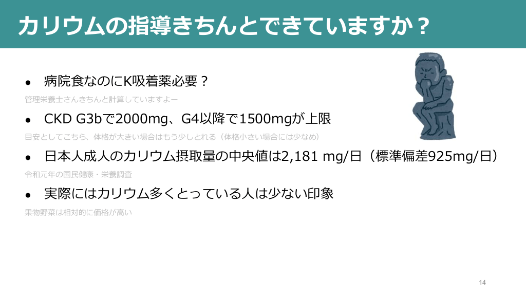 #14. カリウムの指導きちんとできていますか︖ ● 病院⾷なのにK吸着薬必要︖ 管理栄養⼠さんきちんと計算していますよー ● CKD G3bで2000mg、G4以降で1500mgが上限 ⽬安としてこちら、体格が⼤きい場合はもう少しとれる(体格⼩さい場合には少なめ) ● ⽇本⼈成⼈のカリウム摂取量の中央値は2,181 mg/⽇(標準偏差925mg/⽇) 令和元年の国⺠健康・栄養調査 ● 実際にはカリウム多くとっている⼈は少ない印象 果物野菜は相対的に価格が⾼い 14