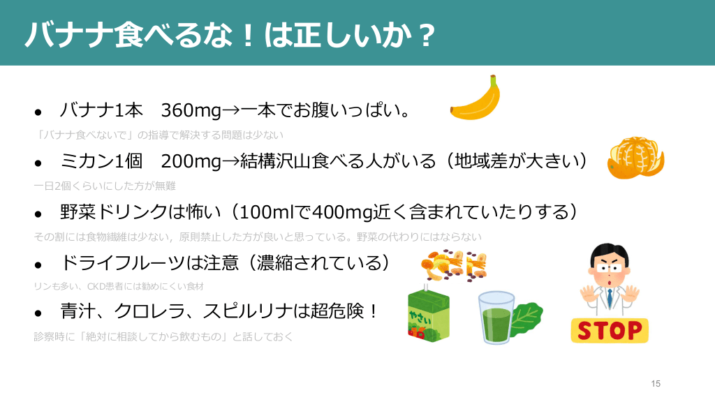 #15. バナナ⾷べるな︕は正しいか︖ ● バナナ1本 360mg→⼀本でお腹いっぱい。 「バナナ⾷べないで」の指導で解決する問題は少ない ● ミカン1個 200mg→結構沢⼭⾷べる⼈がいる(地域差が⼤きい) ⼀⽇2個くらいにした⽅が無難 ● 野菜ドリンクは怖い(100mlで400mg近く含まれていたりする) その割には⾷物繊維は少ない,原則禁⽌した⽅が良いと思っている。野菜の代わりにはならない ● ドライフルーツは注意(濃縮されている) リンも多い、CKD患者には勧めにくい⾷材 ● ⻘汁、クロレラ、スピルリナは超危険︕ 診察時に「絶対に相談してから飲むもの」と話しておく 15