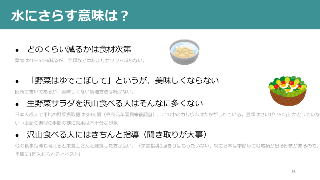 #16. ⽔にさらす意味は︖ ● どのくらい減るかは⾷材次第 葉物は4050%減るが、芋類などはあまりカリウム減らない。 ● 「野菜はゆでこぼして」というが、美味しくならない 随所に書いてあるが、美味しくない調理⽅法は続かない。 ● ⽣野菜サラダを沢⼭⾷べる⼈はそんなに多くない ⽇本⼈成⼈で平均の野菜摂取量は300g弱(令和元年国⺠栄養調査)、この中のカリウムはたかがしれている。⾖類はせいぜい60gしかとっていな い→上記の調理の⼿間の割に効果は不⼗分な印象 ● 沢⼭⾷べる⼈にはきちんと指導(聞き取りが⼤事) 他の⾷事指導も考えると栄養⼠さんと連携した⽅が良い。(栄養指導1回きりはもったいない、特に⽇本は季節毎に地域柄が出る印象があるので、 季節に1回⼊れられるとベスト) 16