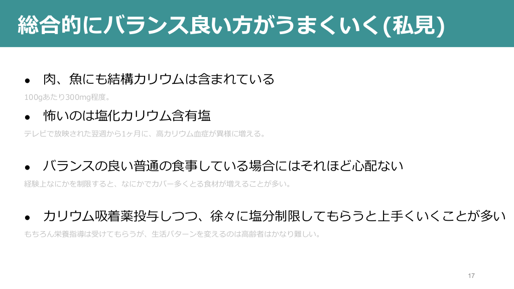 #17. 総合的にバランス良い⽅がうまくいく(私⾒) ● ⾁、⿂にも結構カリウムは含まれている 100gあたり300mg程度。 ● 怖いのは塩化カリウム含有塩 テレビで放映された翌週から1ヶ⽉に、⾼カリウム⾎症が異様に増える。 ● バランスの良い普通の⾷事している場合にはそれほど⼼配ない 経験上なにかを制限すると、なにかでカバー多くとる⾷材が増えることが多い。 ● カリウム吸着薬投与しつつ、徐々に塩分制限してもらうと上⼿くいくことが多い もちろん栄養指導は受けてもらうが、⽣活パターンを変えるのは⾼齢者はかなり難しい。 17
