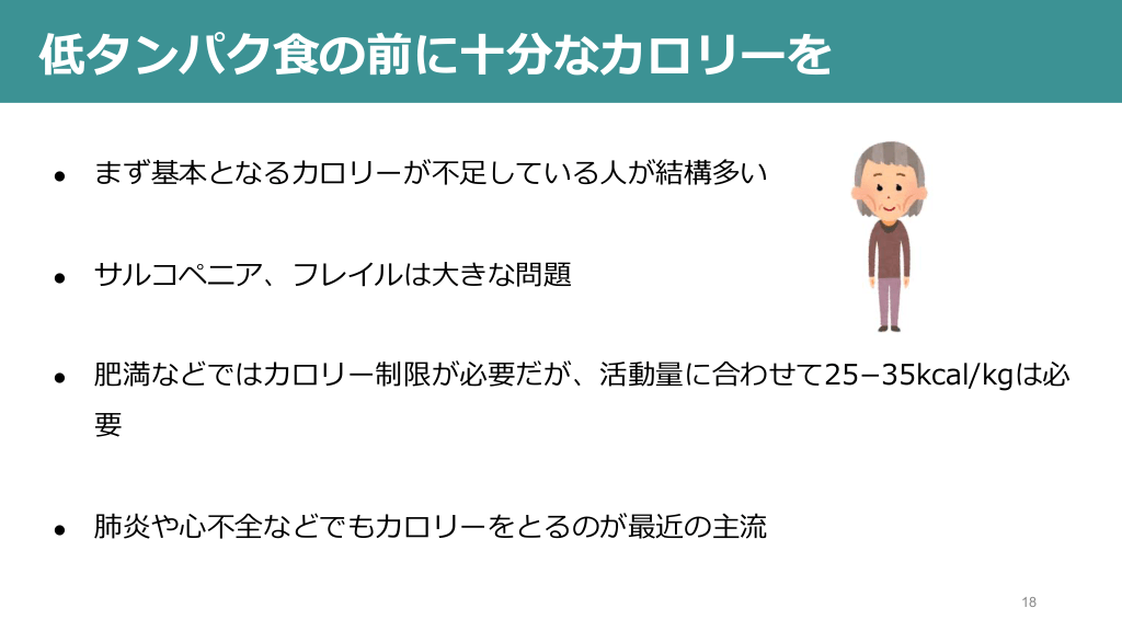 #18. 低タンパク⾷の前に⼗分なカロリーを ● まず基本となるカロリーが不⾜している⼈が結構多い ● サルコペニア、フレイルは⼤きな問題 ● 肥満などではカロリー制限が必要だが、活動量に合わせて2535kcal/kgは必 要 ● 肺炎や⼼不全などでもカロリーをとるのが最近の主流 18