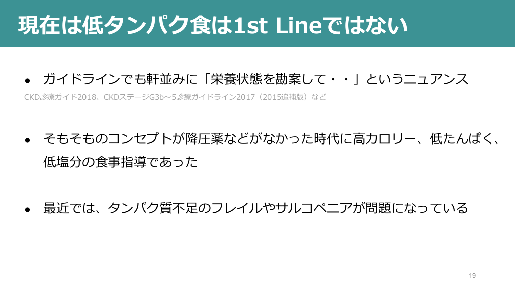 #19. 現在は低タンパク⾷は1st Lineではない ● ガイドラインでも軒並みに「栄養状態を勘案して・・」というニュアンス CKD診療ガイド2018、CKDステージG3b〜5診療ガイドライン2017(2015追補版)など ● そもそものコンセプトが降圧薬などがなかった時代に⾼カロリー、低たんぱく、 低塩分の⾷事指導であった ● 最近では、タンパク質不⾜のフレイルやサルコペニアが問題になっている 19