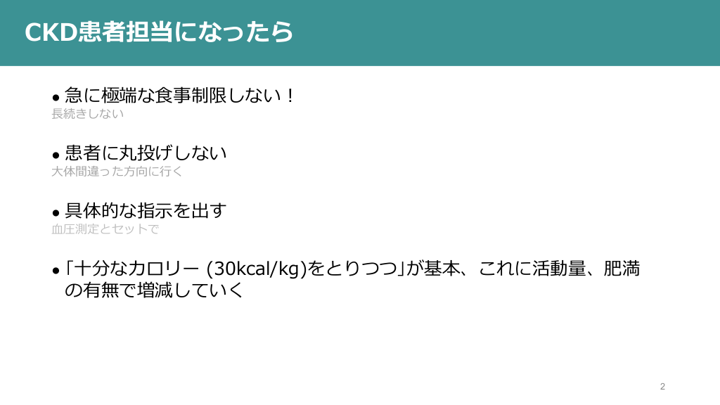 #2. CKD患者担当になったら ● 急に極端な⾷事制限しない︕ ⻑続きしない ● 患者に丸投げしない ⼤体間違った⽅向に⾏く ● 具体的な指⽰を出す ⾎圧測定とセットで ● 「⼗分なカロリー (30kcal/kg)をとりつつ」が基本、これに活動量、肥満 の有無で増減していく 2