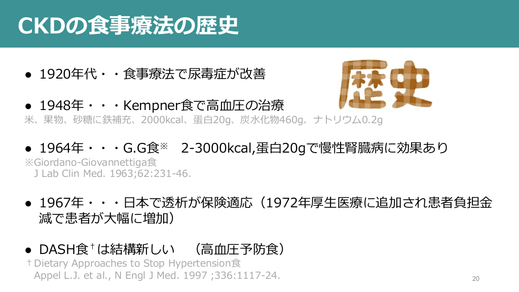 #20. CKDの⾷事療法の歴史 ● 1920年代・・⾷事療法で尿毒症が改善 ● 1948年・・・Kempner⾷で⾼⾎圧の治療 ⽶、果物、砂糖に鉄補充、2000kcal、蛋⽩20g、炭⽔化物460g、ナトリウム0.2g ● 1964年・・・G.G⾷※ 2-3000kcal,蛋⽩20gで慢性腎臓病に効果あり ※Giordano-Giovannettiga⾷ J Lab Clin Med. 1963;62:231-46. ● 1967年・・・⽇本で透析が保険適応(1972年厚⽣医療に追加され患者負担⾦ 減で患者が⼤幅に増加) ● DASH⾷†は結構新しい (⾼⾎圧予防⾷) †Dietary Approaches to Stop Hypertension⾷ Appel L.J. et al., N Engl J Med. 1997 ;336:1117-24. 20