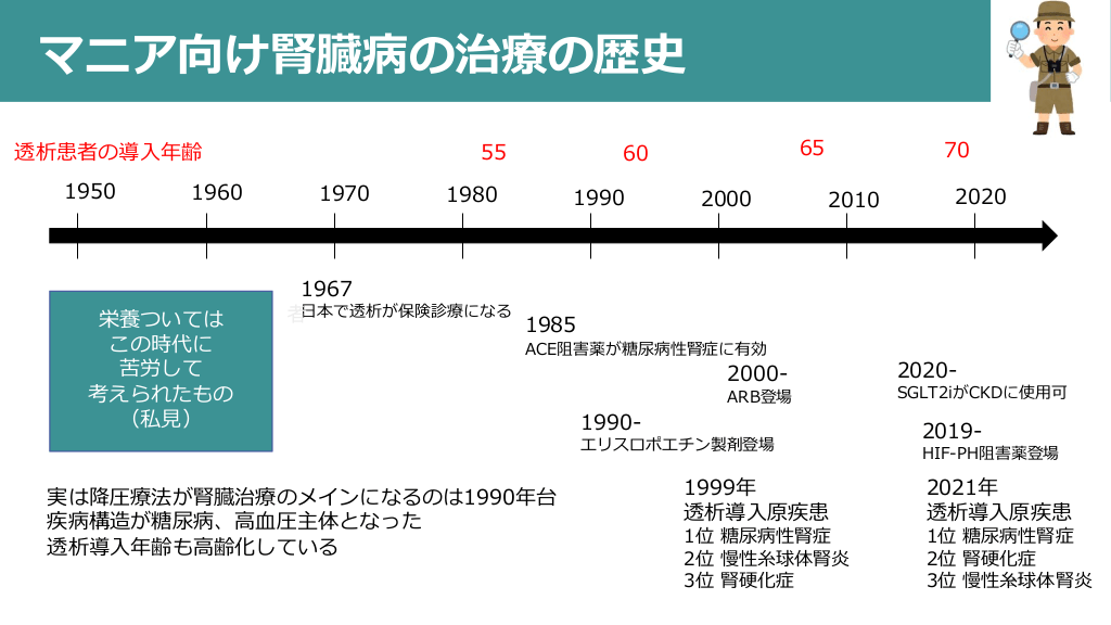 #21. マニア向け腎臓病の治療の歴史 55 透析患者の導⼊年齢 1950 1960 栄養ついては この時代に 苦労して 考えられたもの (私⾒) 1970 1980 1967 者⽇本で透析が保険診療になる 65 60 1990 2000 70 2010 2020 1985 ACE阻害薬が糖尿病性腎症に有効 実は降圧療法が腎臓治療のメインになるのは1990年台 疾病構造が糖尿病、⾼⾎圧主体となった 透析導⼊年齢も⾼齢化している 2000- 1990- ARB登場 エリスロポエチン製剤登場 1999年 透析導⼊原疾患 1位 糖尿病性腎症 2位 慢性⽷球体腎炎 3位 腎硬化症 2020- SGLT2iがCKDに使⽤可 2019- HIF-PH阻害薬登場 2021年 透析導⼊原疾患 1位 糖尿病性腎症 2位 腎硬化症 21 3位 慢性⽷球体腎炎