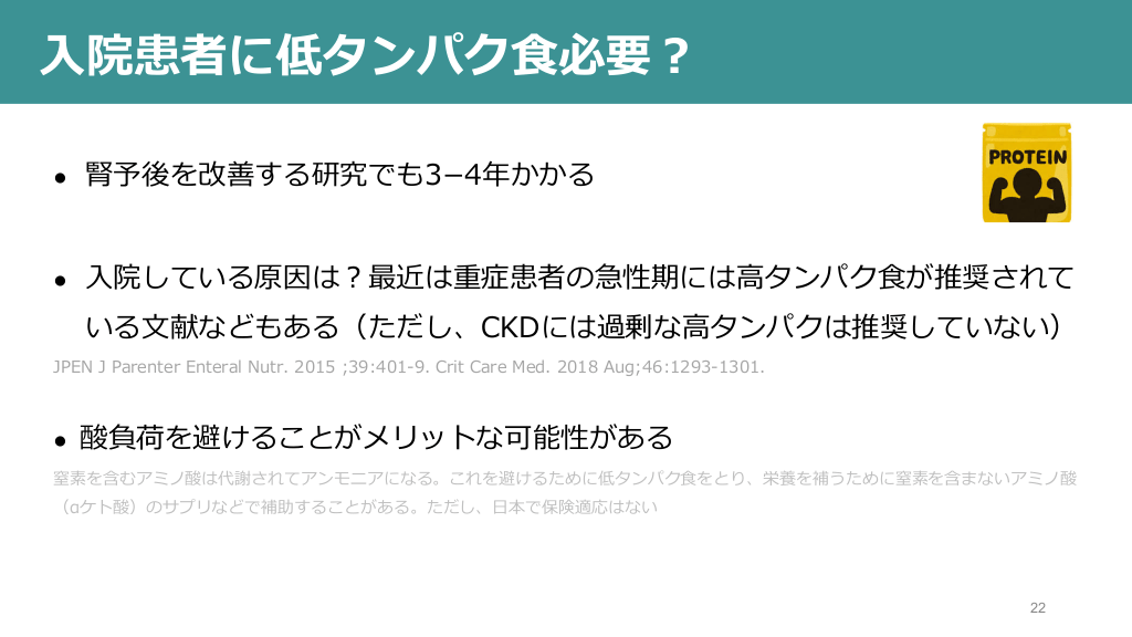 #22. ⼊院患者に低タンパク⾷必要︖ ● 腎予後を改善する研究でも34年かかる ● ⼊院している原因は︖最近は重症患者の急性期には⾼タンパク⾷が推奨されて いる⽂献などもある(ただし、CKDには過剰な⾼タンパクは推奨していない) JPEN J Parenter Enteral Nutr. 2015 ;39:401-9. Crit Care Med. 2018 Aug;46:1293-1301. ● 酸負荷を避けることがメリットな可能性がある 窒素を含むアミノ酸は代謝されてアンモニアになる。これを避けるために低タンパク⾷をとり、栄養を補うために窒素を含まないアミノ酸 (αケト酸)のサプリなどで補助することがある。ただし、⽇本で保険適応はない 22