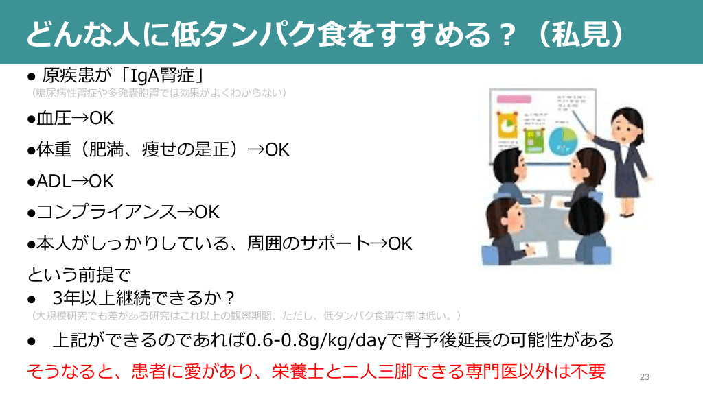 #23. どんな⼈に低タンパク⾷をすすめる︖(私⾒) ● 原疾患が「IgA腎症」 (糖尿病性腎症や多発嚢胞腎では効果がよくわからない) ●⾎圧→OK ●体重(肥満、痩せの是正)→OK ●ADL→OK ●コンプライアンス→OK ●本⼈がしっかりしている、周囲のサポート→OK という前提で ● 3年以上継続できるか︖ (⼤規模研究でも差がある研究はこれ以上の観察期間、ただし、低タンパク⾷遵守率は低い。) ● 上記ができるのであれば0.6-0.8g/kg/dayで腎予後延⻑の可能性がある そうなると、患者に愛があり、栄養⼠と⼆⼈三脚できる専⾨医以外は不要 23