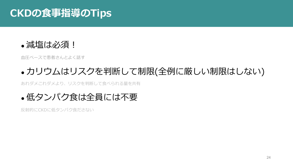 #24. CKDの⾷事指導のTips ● 減塩は必須︕ ⾎圧ベースで患者さんとよく話す ● カリウムはリスクを判断して制限(全例に厳しい制限はしない) あれダメこれダメより、リスクを判断して⾷べられる量を共有 ● 低タンパク⾷は全員には不要 反射的にCKDに低タンパク⾷ださない 24