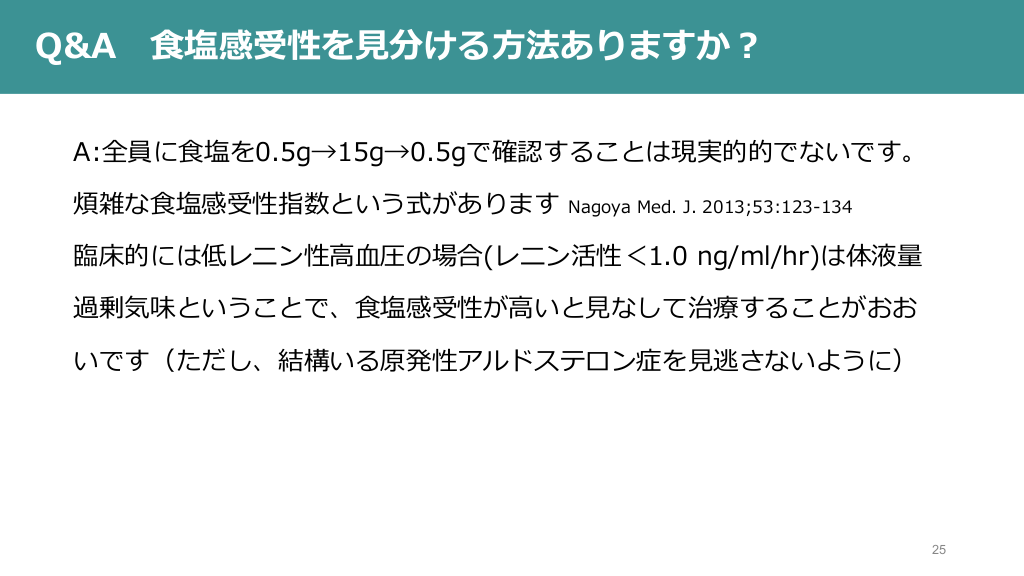 #25. Q&A ⾷塩感受性を⾒分ける⽅法ありますか︖ A:全員に⾷塩を0.5g→15g→0.5gで確認することは現実的的でないです。 煩雑な⾷塩感受性指数という式があります Nagoya Med. J. 2013;53:123-134 臨床的には低レニン性⾼⾎圧の場合(レニン活性<1.0 ng/ml/hr)は体液量 過剰気味ということで、⾷塩感受性が⾼いと⾒なして治療することがおお いです(ただし、結構いる原発性アルドステロン症を⾒逃さないように) 25