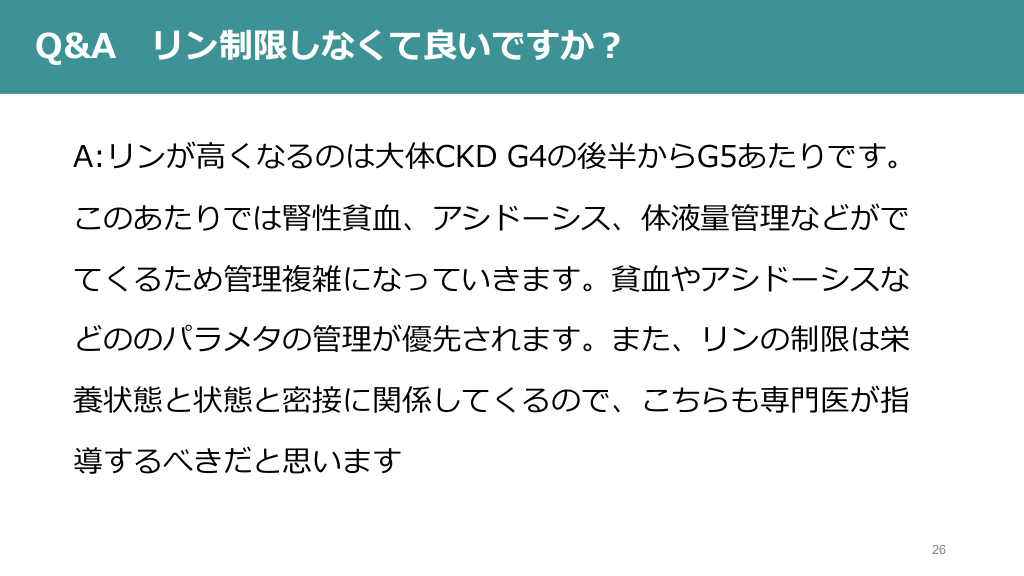 #26. Q&A リン制限しなくて良いですか︖ A:リンが⾼くなるのは⼤体CKD G4の後半からG5あたりです。 このあたりでは腎性貧⾎、アシドーシス、体液量管理などがで てくるため管理複雑になっていきます。貧⾎やアシドーシスな どののパラメタの管理が優先されます。また、リンの制限は栄 養状態と状態と密接に関係してくるので、こちらも専⾨医が指 導するべきだと思います 26