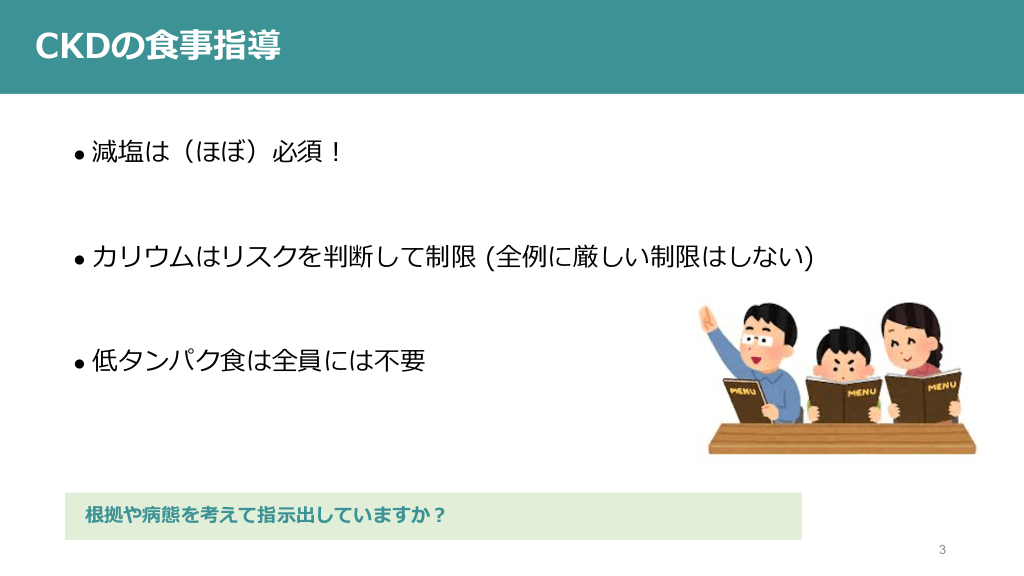#3. CKDの⾷事指導 ● 減塩は(ほぼ)必須︕ ● カリウムはリスクを判断して制限 (全例に厳しい制限はしない) ● 低タンパク⾷は全員には不要 根拠や病態を考えて指⽰出していますか︖ 3