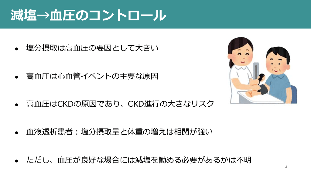 #4. 減塩→⾎圧のコントロール ● 塩分摂取は⾼⾎圧の要因として⼤きい ● ⾼⾎圧は⼼⾎管イベントの主要な原因 ● ⾼⾎圧はCKDの原因であり、CKD進⾏の⼤きなリスク ● ⾎液透析患者︓塩分摂取量と体重の増えは相関が強い ● ただし、⾎圧が良好な場合には減塩を勧める必要があるかは不明 4