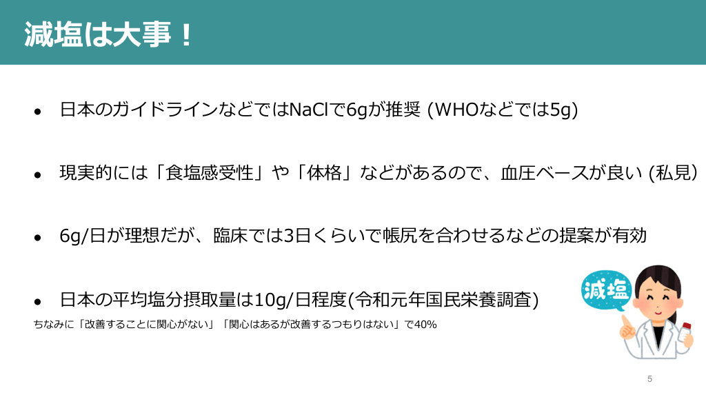 #5. 減塩は⼤事︕ ● ⽇本のガイドラインなどではNaClで6gが推奨 (WHOなどでは5g) ● 現実的には「⾷塩感受性」や「体格」などがあるので、⾎圧ベースが良い (私⾒) ● 6g/⽇が理想だが、臨床では3⽇くらいで帳尻を合わせるなどの提案が有効 ● ⽇本の平均塩分摂取量は10g/⽇程度(令和元年国⺠栄養調査) ちなみに「改善することに関⼼がない」「関⼼はあるが改善するつもりはない」で40% 5