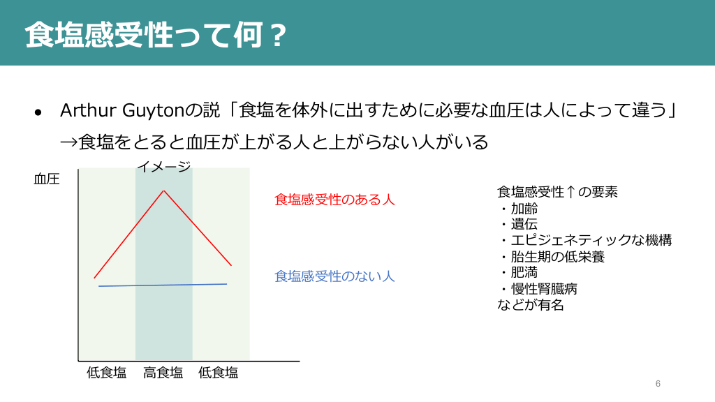 #6. ⾷塩感受性って何︖ ● Arthur Guytonの説「⾷塩を体外に出すために必要な⾎圧は⼈によって違う」 →⾷塩をとると⾎圧が上がる⼈と上がらない⼈がいる イメージ ⾎圧 ⾷塩感受性のある⼈ ⾷塩感受性のない⼈ 低⾷塩 ⾼⾷塩 低⾷塩 ⾷塩感受性↑の要素 ・加齢 ・遺伝 ・エピジェネティックな機構 ・胎⽣期の低栄養 ・肥満 ・慢性腎臓病 などが有名 6