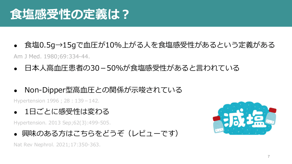 #7. ⾷塩感受性の定義は︖ ● ⾷塩0.5g→15gで⾎圧が10%上がる⼈を⾷塩感受性があるという定義がある Am J Med. 1980;69:334-44. ● ⽇本⼈⾼⾎圧患者の30-50%が⾷塩感受性があると⾔われている ● Non-Dipper型⾼⾎圧との関係が⽰唆されている Hypertension 1996︔28︓139-142. ● 1⽇ごとに感受性は変わる Hypertension. 2013 Sep;62(3):499-505. ● 興味のある⽅はこちらをどうぞ(レビューです) Nat Rev Nephrol. 2021;17:350-363. 7