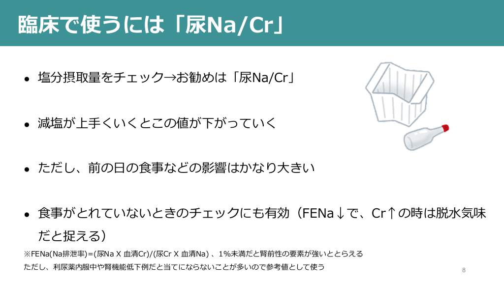 #8. 臨床で使うには「尿Na/Cr」 ● 塩分摂取量をチェック→お勧めは「尿Na/Cr」 ● 減塩が上⼿くいくとこの値が下がっていく ● ただし、前の⽇の⾷事などの影響はかなり⼤きい ● ⾷事がとれていないときのチェックにも有効(FENa↓で、Cr↑の時は脱⽔気味 だと捉える) ※FENa(Na排泄率)=(尿Na X ⾎清Cr)/(尿Cr X ⾎清Na) 、1%未満だと腎前性の要素が強いととらえる ただし、利尿薬内服中や腎機能低下例だと当てにならないことが多いので参考値として使う 8