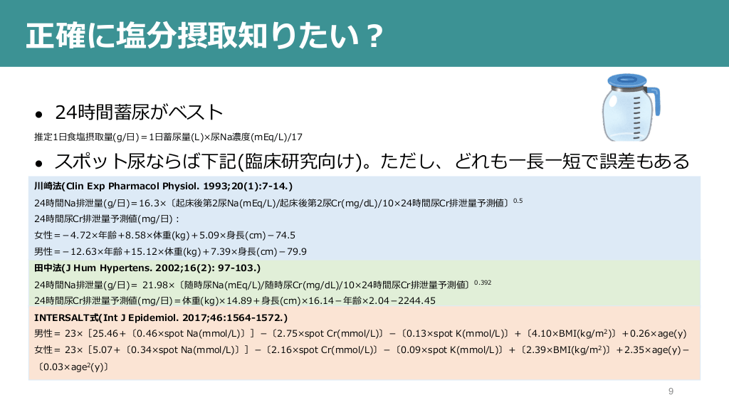 #9. 正確に塩分摂取知りたい︖ ● 24時間蓄尿がベスト 推定1⽇⾷塩摂取量(g/⽇)=1⽇蓄尿量(L)×尿Na濃度(mEq/L)/17 ● スポット尿ならば下記(臨床研究向け)。ただし、どれも⼀⻑⼀短で誤差もある 川崎法(Clin Exp Pharmacol Physiol. 1993;20(1):7-14.) 24時間Na排泄量(g/⽇)=16.3×〔起床後第2尿Na(mEq/L)/起床後第2尿Cr(mg/dL)/10×24時間尿Cr排泄量予測値〕0.5 24時間尿Cr排泄量予測値(mg/⽇)︓ ⼥性=-4.72×年齢+8.58×体重(kg)+5.09×⾝⻑(cm)-74.5 男性=-12.63×年齢+15.12×体重(kg)+7.39×⾝⻑(cm)-79.9 ⽥中法(J Hum Hypertens. 2002;16(2): 97-103.) 24時間Na排泄量(g/⽇)= 21.98×〔随時尿Na(mEq/L)/随時尿Cr(mg/dL)/10×24時間尿Cr排泄量予測値〕0.392 24時間尿Cr排泄量予測値(mg/⽇)=体重(kg)×14.89+⾝⻑(cm)×16.14-年齢×2.04-2244.45 INTERSALT式(Int J Epidemiol. 2017;46:1564-1572.) 男性= 23×[25.46+〔0.46×spot Na(mmol/L)〕]-〔2.75×spot Cr(mmol/L)〕-〔0.13×spot K(mmol/L)〕+〔4.10×BMI(kg/m2)〕+0.26×age(y) ⼥性= 23×[5.07+〔0.34×spot Na(mmol/L)〕]-〔2.16×spot Cr(mmol/L)〕-〔0.09×spot K(mmol/L)〕+〔2.39×BMI(kg/m2)〕+2.35×age(y)- 〔0.03×age2(y)〕 9