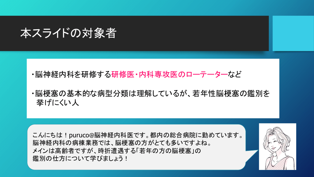 #2. 本スライドの対象者 ・脳神経内科を研修する研修医・内科専攻医のローテーターなど ・脳梗塞の基本的な病型分類は理解しているが、若年性脳梗塞の鑑別を 挙げにくい人 こんにちは!puruco@脳神経内科医です。都内の総合病院に勤めています。 脳神経内科の病棟業務では、脳梗塞の方がとても多いですよね。 メインは高齢者ですが、時折遭遇する「若年の方の脳梗塞」の 鑑別の仕方について学びましょう!