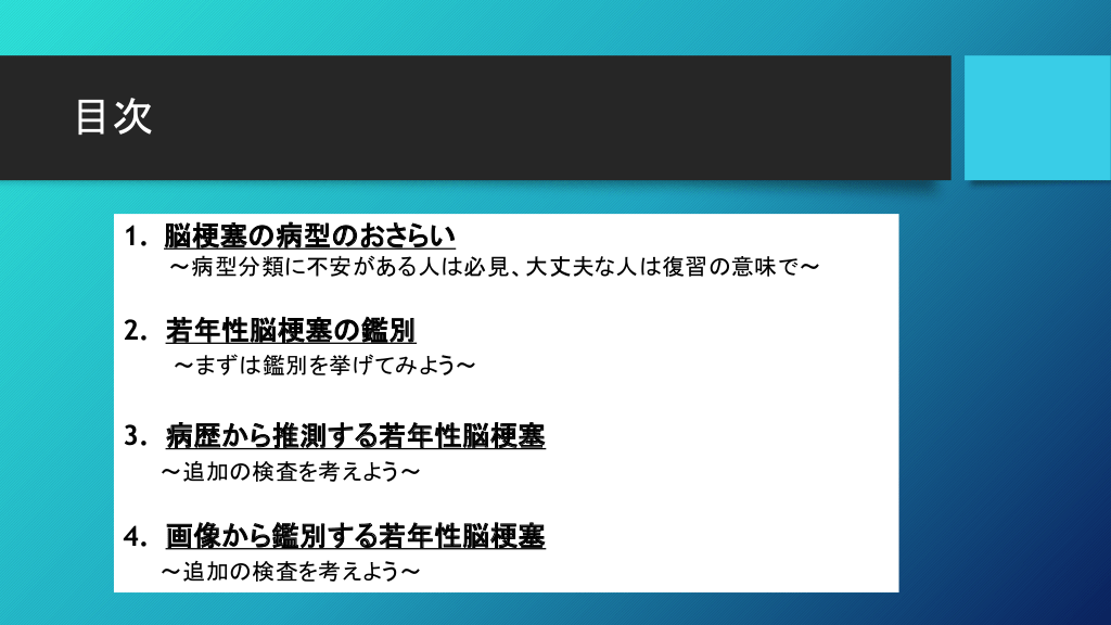 #3. 目次 1. 脳梗塞の病型のおさらい ~病型分類に不安がある人は必見、大丈夫な人は復習の意味で~ 2. 若年性脳梗塞の鑑別 ~まずは鑑別を挙げてみよう~ 3. 病歴から推測する若年性脳梗塞 ~追加の検査を考えよう~ 4. 画像から鑑別する若年性脳梗塞 ~追加の検査を考えよう~
