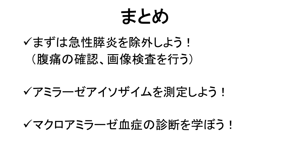 #10. まとめ まずは急性膵炎を除外しよう! (腹痛の確認、画像検査を行う) アミラーゼアイソザイムを測定しよう! マクロアミラーゼ血症の診断を学ぼう!