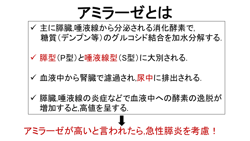 #2. アミラーゼとは 主に膵臓,唾液線から分泌される消化酵素で, 糖質(デンプン等)のグルコシド結合を加水分解する. 膵型(P型)と唾液線型(S型)に大別される. 血液中から腎臓で濾過され,尿中に排出される. 膵臓,唾液線の炎症などで血液中への酵素の逸脱が増加すると,高値を呈する. アミラーゼが高いと言われたら,急性膵炎を考慮!