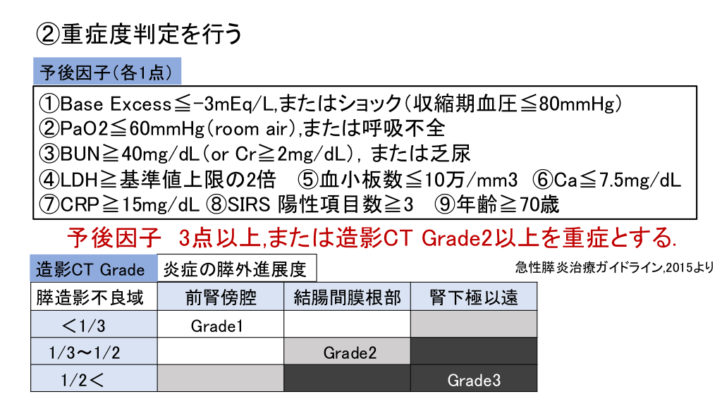 #5. ②重症度判定を行う 予後因子(各1点) ①Base Excess≦-3mEq/L,またはショック(収縮期血圧≦80mmHg) ②PaO2≦60mmHg(room air),または呼吸不全 ③BUN≧40mg/dL(or Cr≧2mg/dL),または乏尿 ④LDH≧基準値上限の2倍 ⑤血小板数≦10万/mm3 ⑥Ca≦7.5mg/dL ⑦CRP≧15mg/dL ⑧SIRS 陽性項目数≧3 ⑨年齢≧70歳 予後因子 3点以上,または造影CT Grade2以上を重症とする. 造影CT Grade 炎症の膵外進展度 膵造影不良域 <1/3 1/3〜1/2 1/2< 前腎傍腔 急性膵炎治療ガイドライン,2015より 結腸間膜根部 腎下極以遠 Grade1 Grade2 Grade3