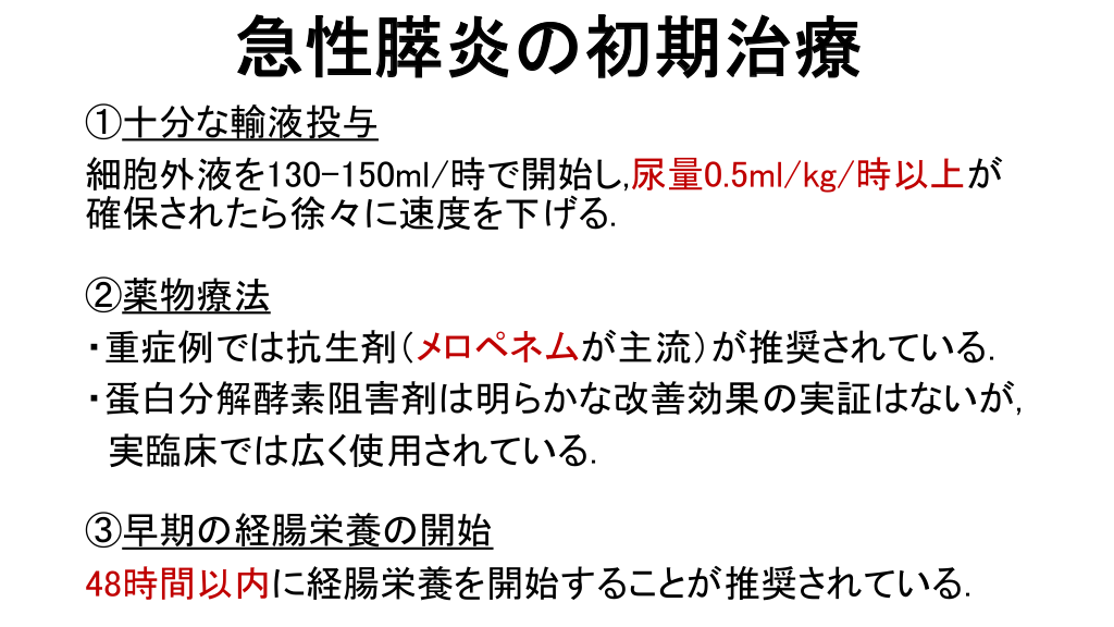 #6. 急性膵炎の初期治療 ①十分な輸液投与 細胞外液を130-150ml/時で開始し,尿量0.5ml/kg/時以上が 確保されたら徐々に速度を下げる. ②薬物療法 ・重症例では抗生剤(メロペネムが主流)が推奨されている. ・蛋白分解酵素阻害剤は明らかな改善効果の実証はないが, 実臨床では広く使用されている. ③早期の経腸栄養の開始 48時間以内に経腸栄養を開始することが推奨されている.