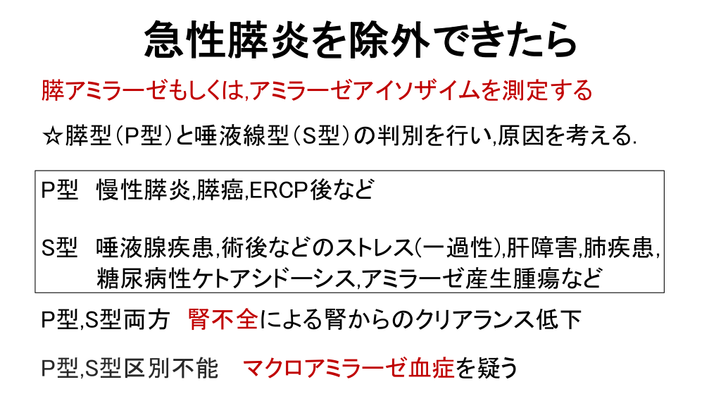#7. 急性膵炎を除外できたら 膵アミラーゼもしくは,アミラーゼアイソザイムを測定する ☆膵型(P型)と唾液線型(S型)の判別を行い,原因を考える. P型 慢性膵炎,膵癌,ERCP後など S型 唾液腺疾患,術後などのストレス(一過性),肝障害,肺疾患, 糖尿病性ケトアシドーシス,アミラーゼ産生腫瘍など P型,S型両方 腎不全による腎からのクリアランス低下 P型,S型区別不能 マクロアミラーゼ血症を疑う