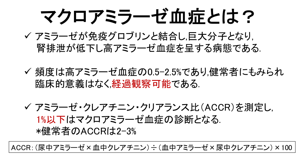 #8. マクロアミラーゼ血症とは? アミラーゼが免疫グロブリンと結合し,巨大分子となり,腎排泄が低下し高アミラーゼ血症を呈する病態である. 頻度は高アミラーゼ血症の0.5-2.5%であり,健常者にもみられ 臨床的意義はなく,経過観察可能である. アミラーゼ・クレアチニン・クリアランス比(ACCR)を測定し, 1%以下はマクロアミラーゼ血症の診断となる. *健常者のACCRは2-3% ACCR:(尿中アミラーゼ×血中クレアチニン)÷(血中アミラーゼ×尿中クレアチニン)×100