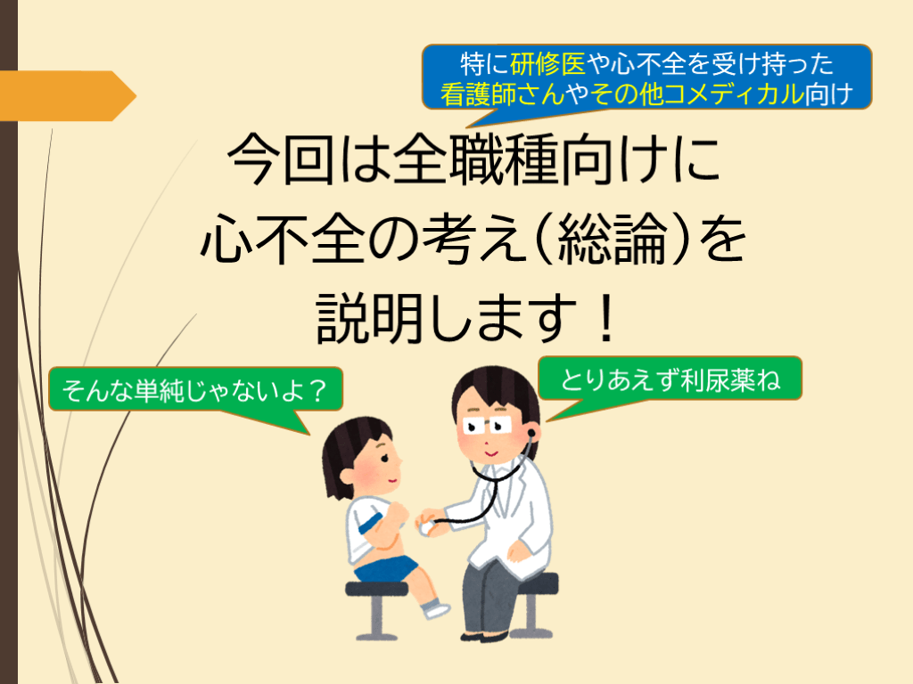 心不全を診療する上では様々な側面を意識しながら診療する必要があります。具体的には急性心不全に対する救命や症状緩和であったり、心不全の原因(基礎心疾患)の精査、増悪因子の特定や生活・環境の調整、薬物療法や侵襲的治療などです。複雑なこれらについて、初めて心不全を受け持ったときでも理解できるようにスライドでまとめました。日常診療にお役立ていただけたら幸いです。